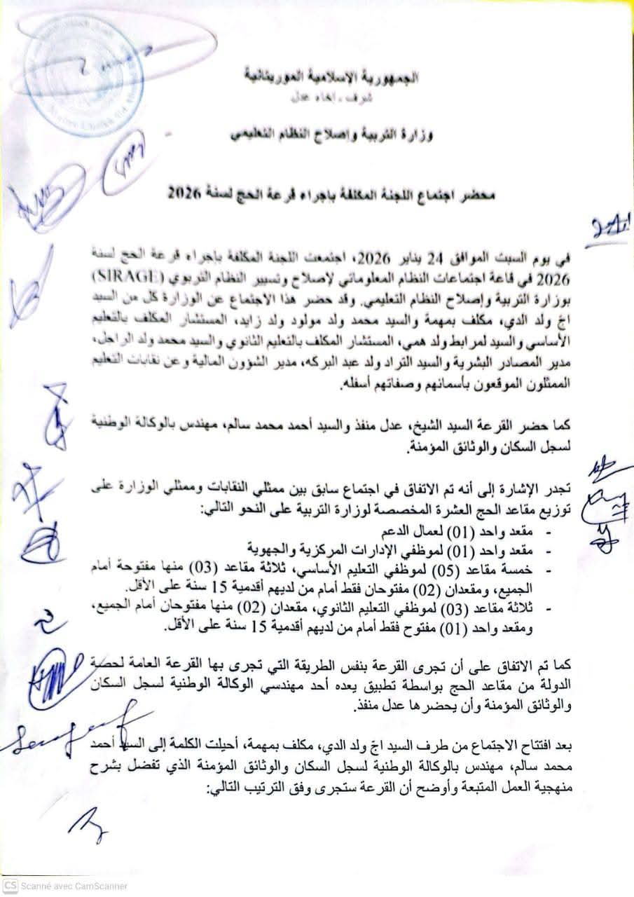 الأخبار (نواكشوط) – أعلنت وزارة التربية وإصلاح النظام التعليمي عن أسماء الفائزين بقرعة الحج المخصصة للقطاع وذلك للعام الهجري 1447.