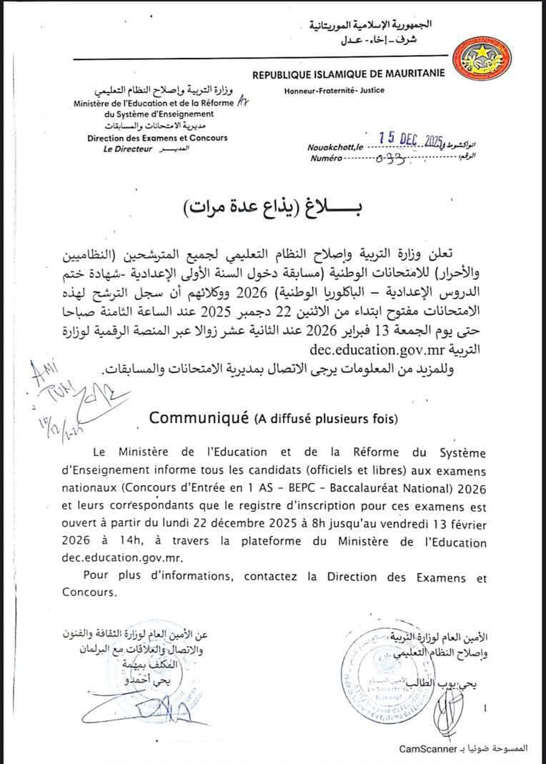 وأضافت الوزارة أن سجل الترشح لهذه الامتحانات مفتوح ابتداء من الاثنين 22 دجمبر 2025 عند الساعة الثامنة صباحا حتى يوم الجمعة 13 فبراير 2026 عند الثانية عشر زوالا عبر المنصة الرقمية لوزارة dec.education.gov.mr.