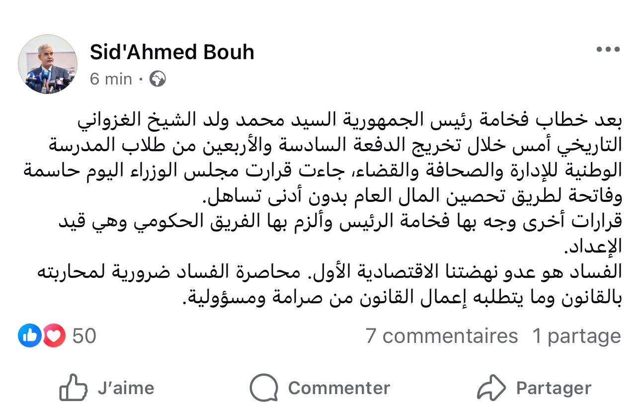 وأكد ولد ابوه في تدوينة عبر فيسبوك، أن الرئيس محمد ولد الغزواني وجه بقرارات أخرى وألزم بها الفريق الحكومي وهي قيد الإعداد.