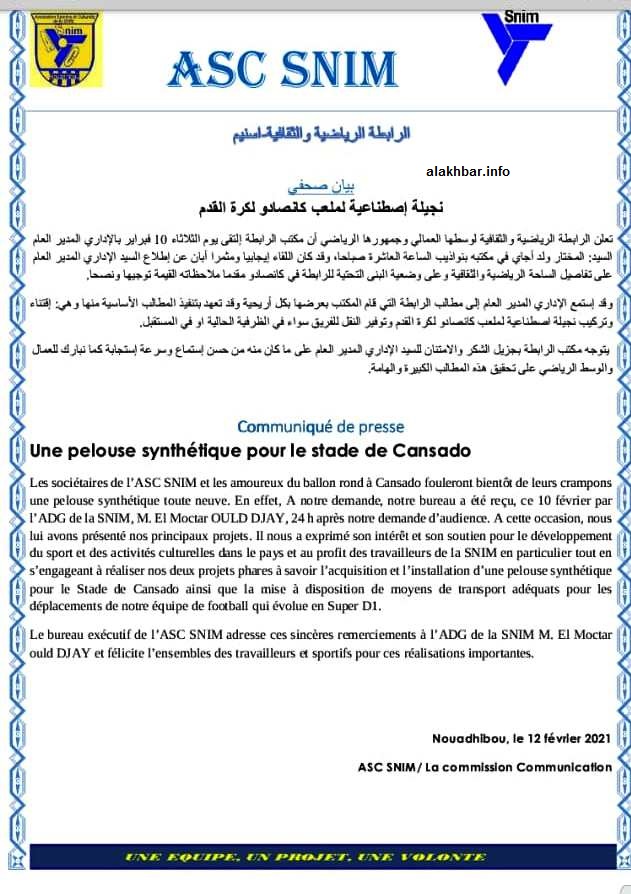 الأخبار(نواذيبو)- كشفت الرابطة الرياضية والثقافية لنادي اسنيم عن تلقيها وعد من الإداري المدير العام المختار أجاي بتوفير نيجلة اصطناعية للملعب الموجود في كانصادو وتأمين النقل للنادي سواء في الظرف الحالي أو المستقبل.