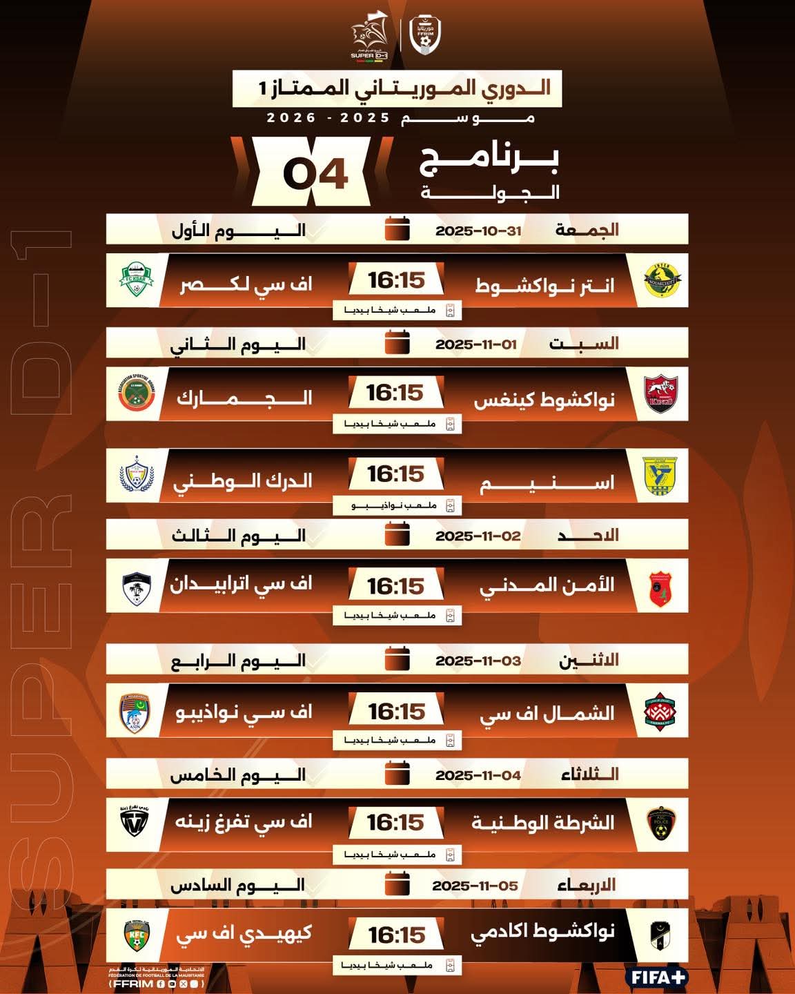 الأخبار (نواكشوط) - أعلنت الاتحادية الموريتانية لكرة القدم البرنامج الرسمي للجولة الرابعة من الدوري الموريتاني الممتاز1 لموسم 2025-2026،